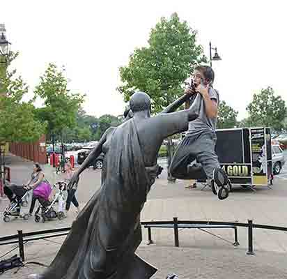 This chap has clambered up a plinth for a snapshot with this statue of a woman spinning her child in the airCredit: Splitpics.uk
